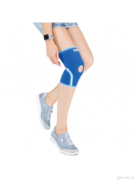 Циркулярный бандаж из неопрена со стабилизирующим силиконовым кольцом и отверстием над коленной чашечкой.